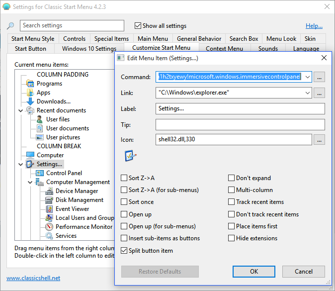 A month ago, I figured out how to make the Settings app open when clicking the "Settings" menu item (circled in red in the image below). Now the Classic Start Menu's Settings button cascades to provide the Control Panel, Computer Management, Network Connections and Printers options, while being itself a hot shortcut that opens the Settings app when clicked: ![]() Just today, I learned about the new PC Settings action in Classic Shell and gave it a try. Unfortunately, the new Settings button stops working as soon as a sub-item is added, even with the "Split button item" option enabled. I am hoping this can be fixed in a future version. In the meantime, to make a menu item that opens the Settings app while containing sub-items itself, make the following changes in the desired menu item's properties: Command: shell:AppsFolder\windows.immersivecontrolpanel_cw5n1h2txyewy!microsoft.windows.immersivecontrolpanel Link: "C:\Windows\Explorer.exe" Split button item: Enabled