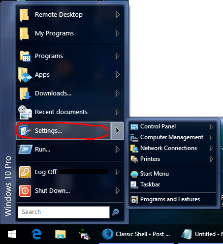 | Windows 10 Classic Shell needs a Windows10 Settings shortcut http://www.classicshell.net/forum/viewtopic.php?f=7&t=4877 |